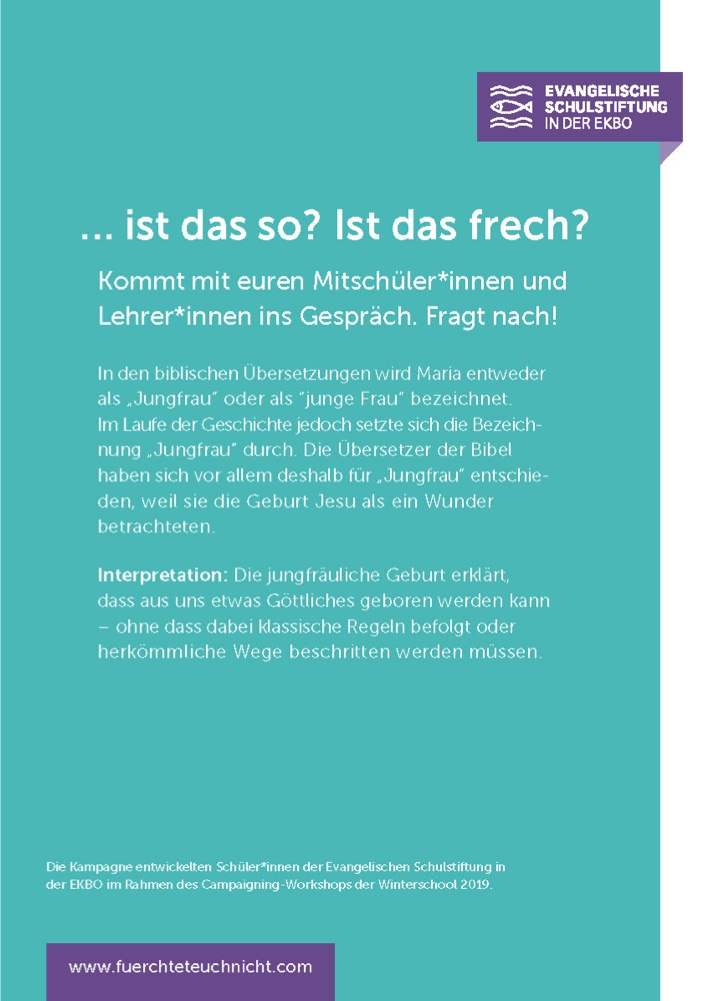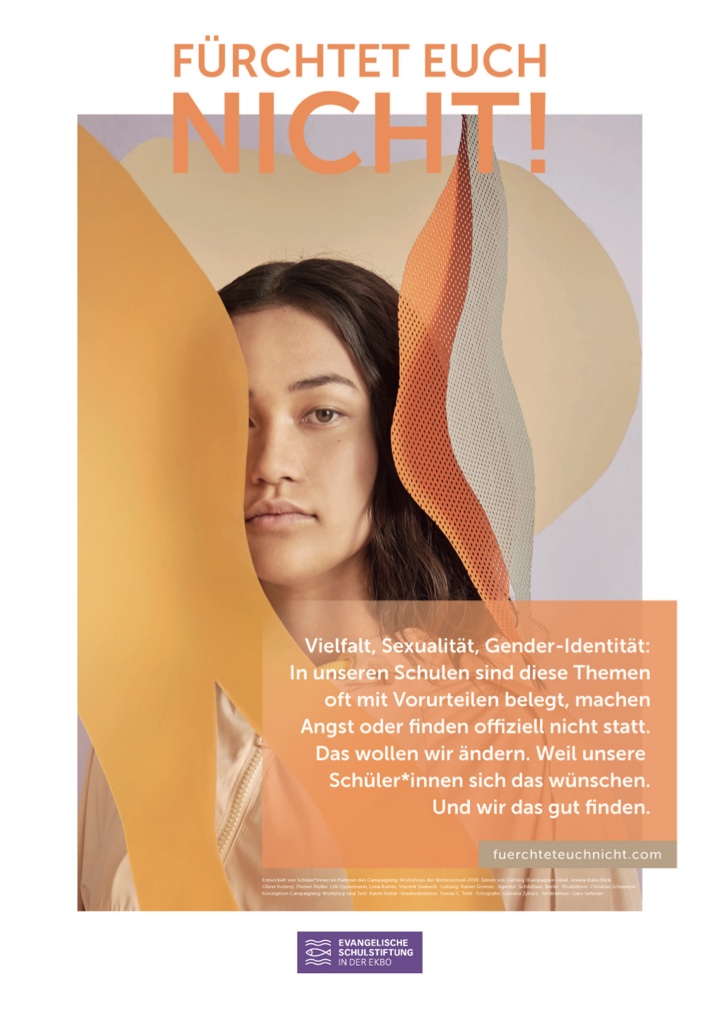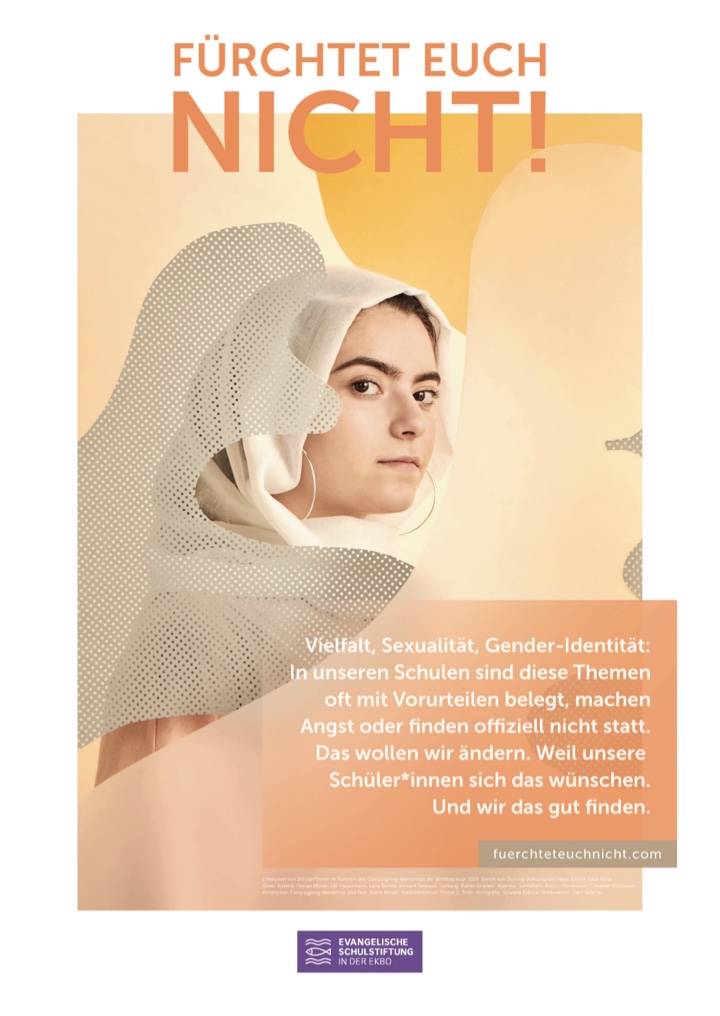 Den Themen Vielfalt, Sexualität und Gender-Identität fehlt es in Schule und Bildung an Sichtbarkeit. So das Ergebnis einer Studie, die wir mit der Boston Consulting Group durchgeführt und in deren Rahmen wir Schüler*innen der evangelischen Schulen befragt hatten. Am Ende stand der Wunsch der Schüler*innen nach Sichtbarkeit und Kommunikation dieser für sie wichtigen Themen. Ein erster Hebel war schnell gefunden: In einer mehrtägigen Winterschool qualifizierten wir Schüler*innen für die Entwicklung von Kampagnen. Die Idee zur Kampagne entstand in diesem von uns moderierten Prozess. Das Ergebnis: Eine Plakat-Kampagne, eine Website und Postkarten, ein Imagefilm und Events. Unter anderem auch eine Pressekonferenz, die wir mit der Axel Springer SE durchführten. 2020 wurde die Kampagne mit dem Max-Spohr-Preis des Völklinger Kreis e. V. ausgezeichnet. Weil die für Schüler*innen wichtigen Themen sichtbar gelungen kommuniziert wurden.